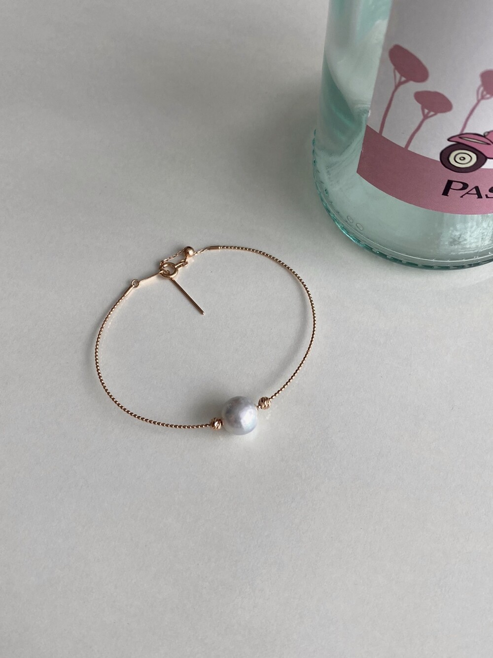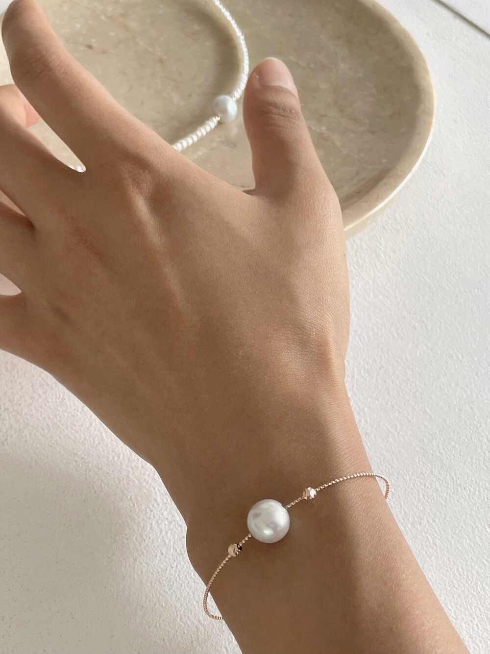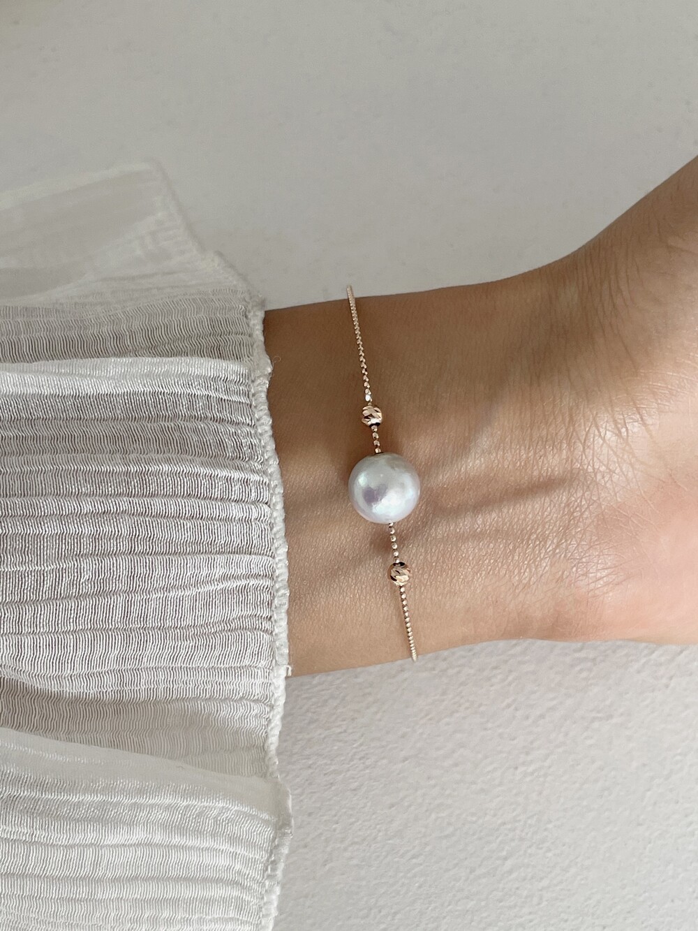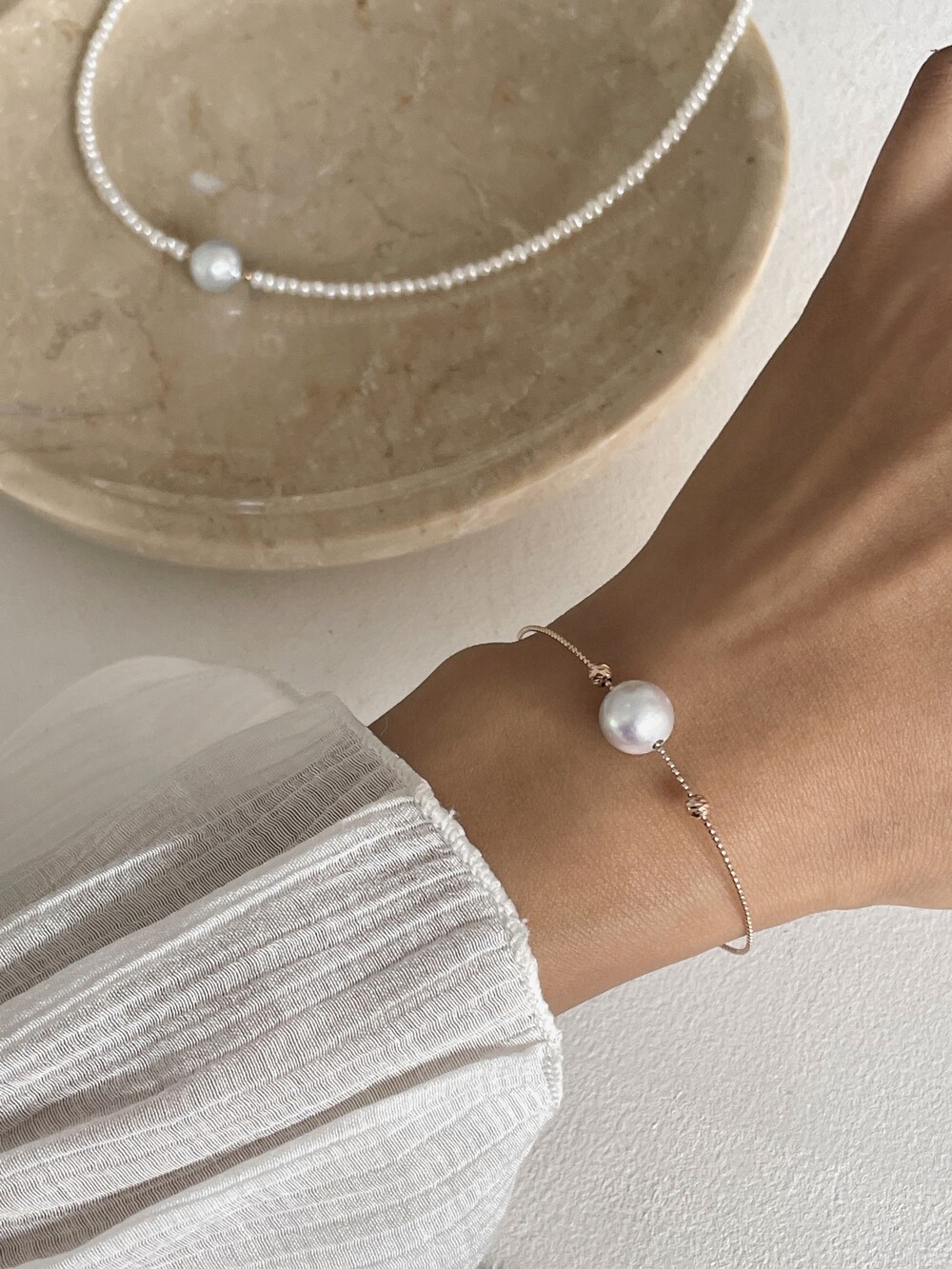 뱅글의 금속 볼을 움직일수 있어서 중심부의 진주가 자유롭게 움직이도록 착용할수도있고