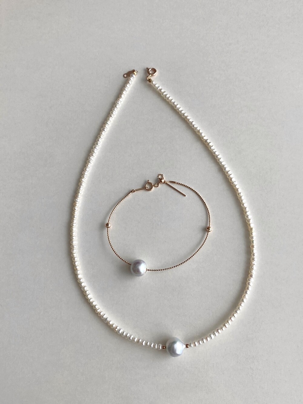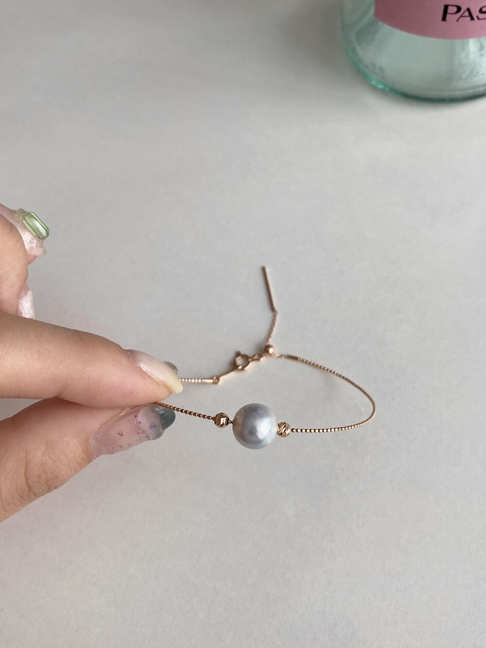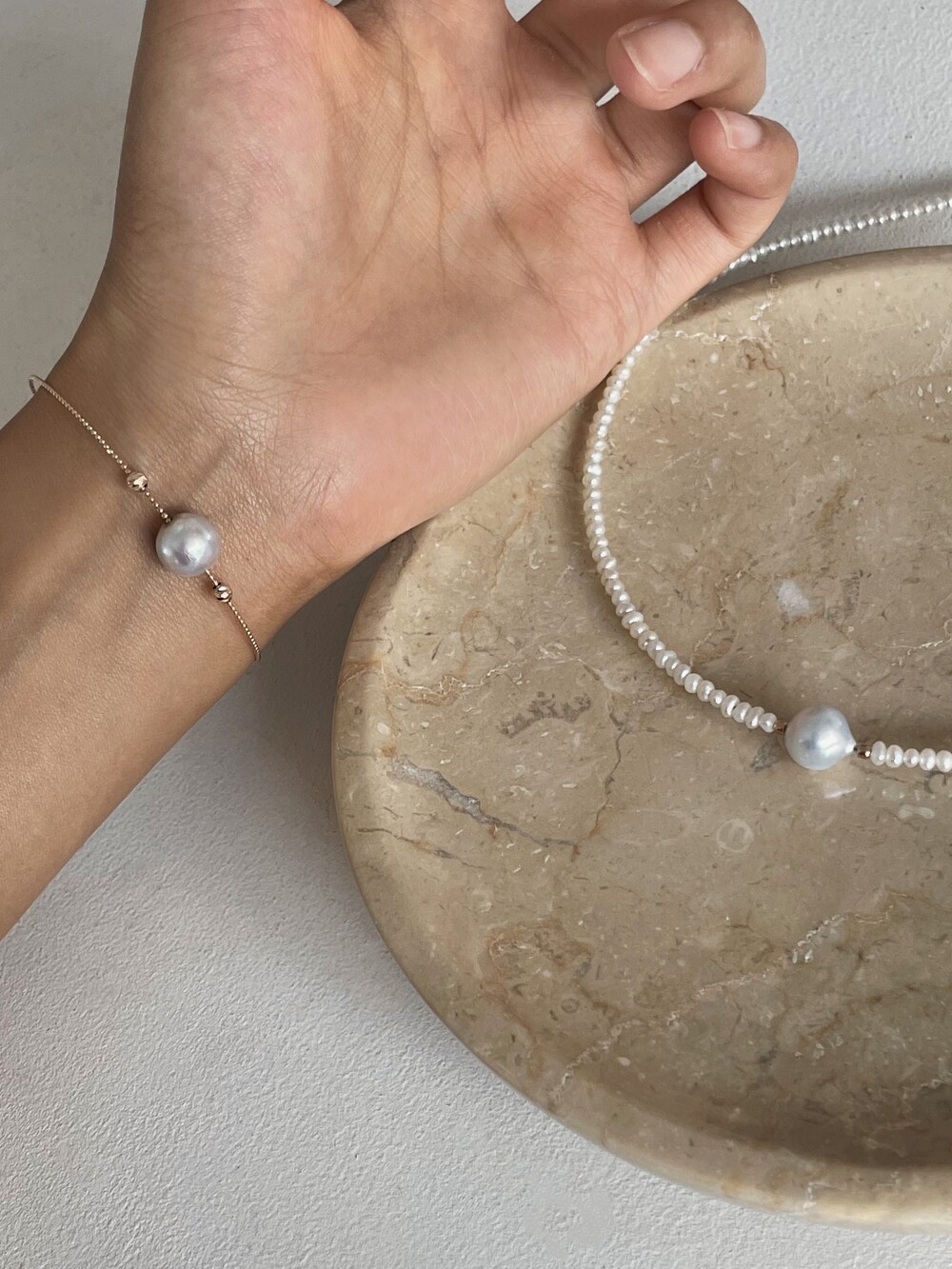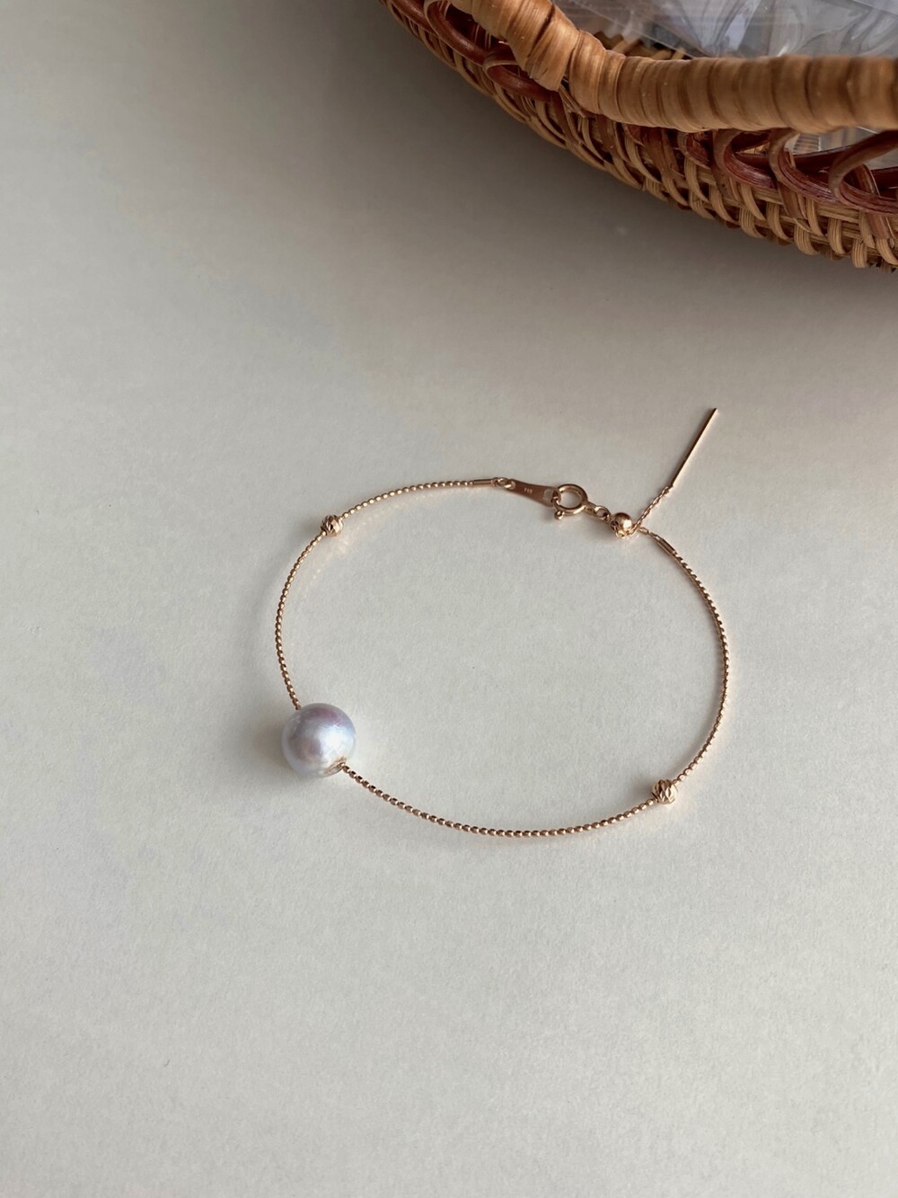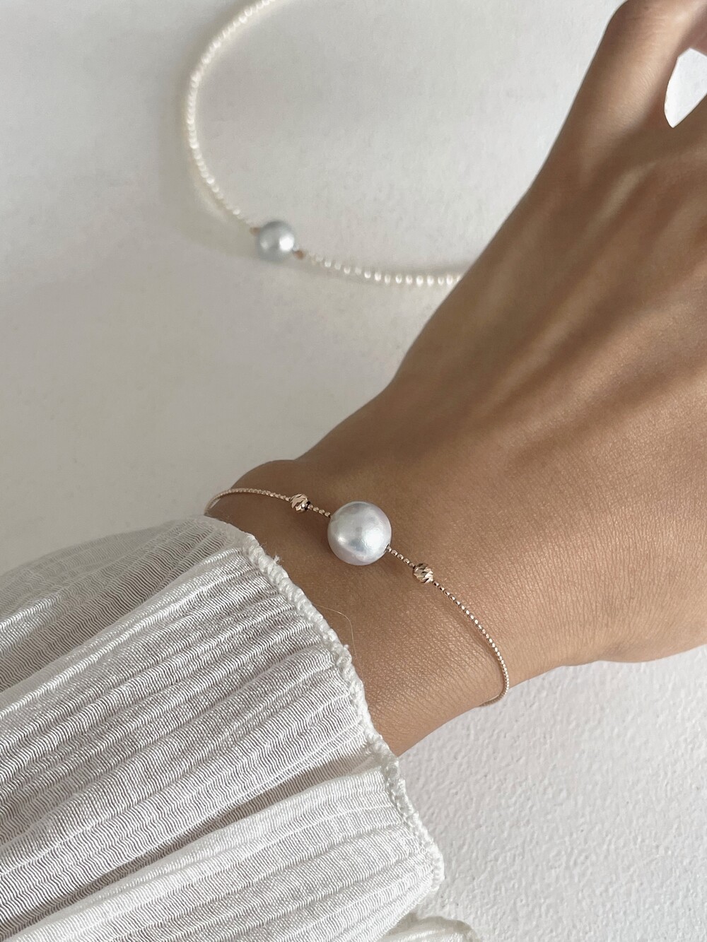 뱅글의 금속 볼을 움직일수 있어서 중심부의 진주가 자유롭게 움직이도록 착용할수도있고